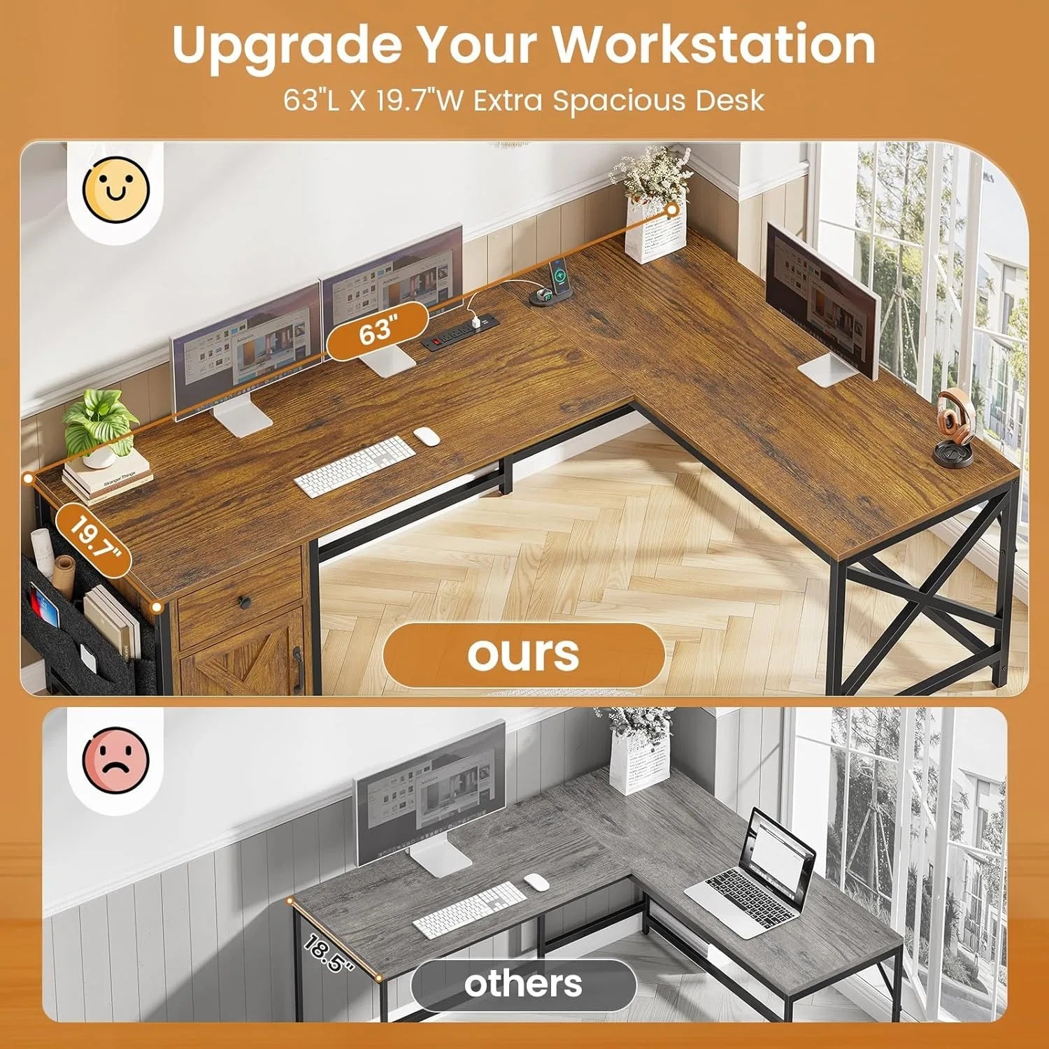 63" L Shaped Farmhouse Convertible Desk with Drawer, Power Strip & Storage Cabinet