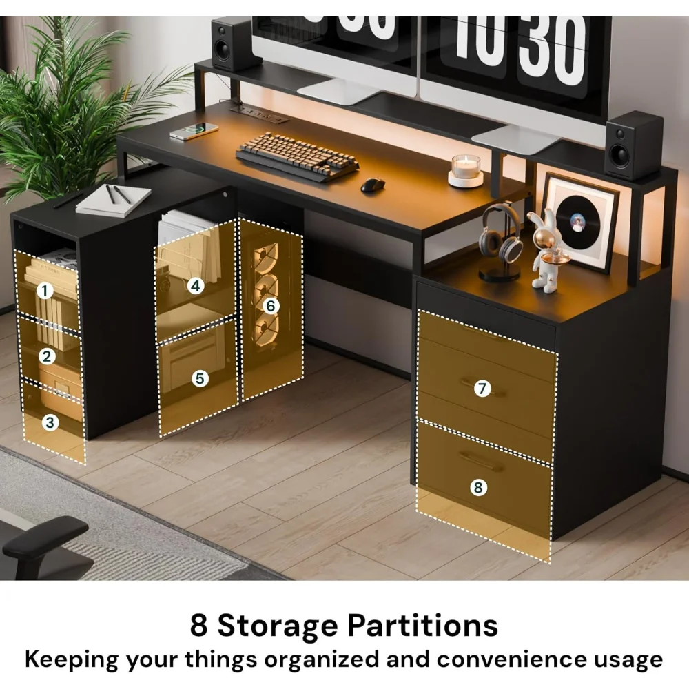 65.7" L Shaped Desk with Drawers, Corner Computer Gaming Desk with Power Outlet & LED Light, Office Desk with File Drawer