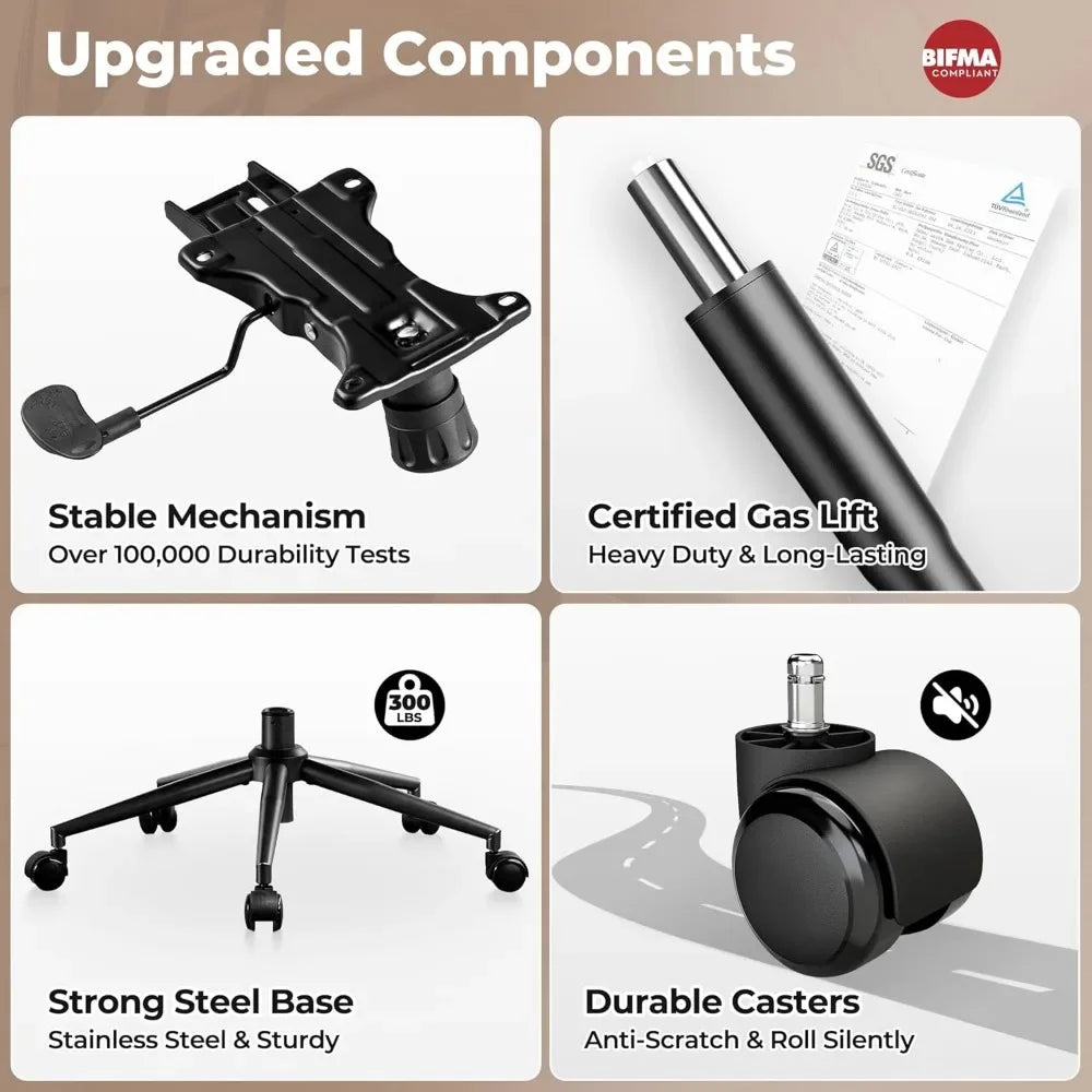 Sturdy Construction: This padded task armchair features strong metal frame, curved backrest brackets that follow the curve of the human spine for stress relief, tested adjustment mechanisms and gaslift for stability even for tall and strong people, and high-quality 360° swivel rolling rotating casters avoid scratching the floor, can support up to 300 lbs. Whether you're working or relaxing, this modern chair offers a comfortable experience
