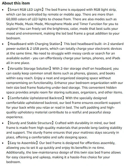 Special Feature        No Box Spring Needed, Remote Control, Lighted, Squeak Resistant, USB Port