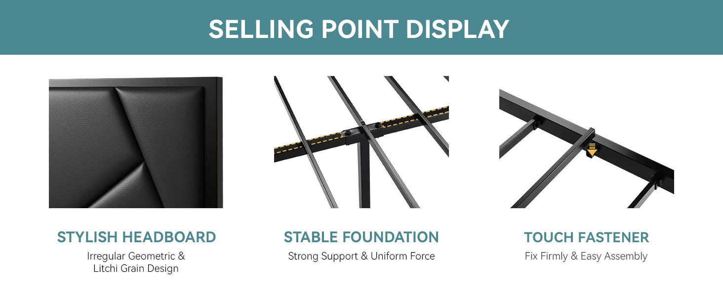 Elegant Headboard: Features a soft, padded headboard upholstered in premium faux leather with an elegant lychee grain texture, adding a touch of sophistication and comfort to your bedroom
