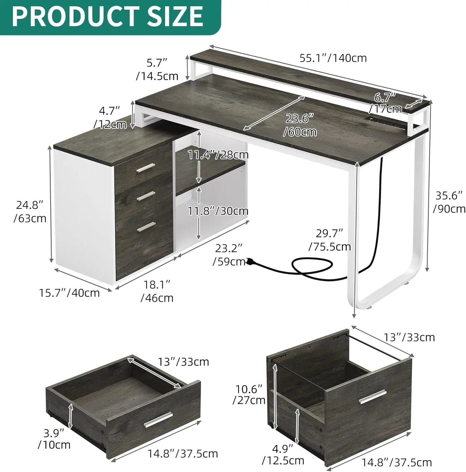 L Shaped Desk with Drawers, 55" Corner Computer Desk with Power Outlets, L-Shaped Desk with LED Lights & File Cabinet for Home O