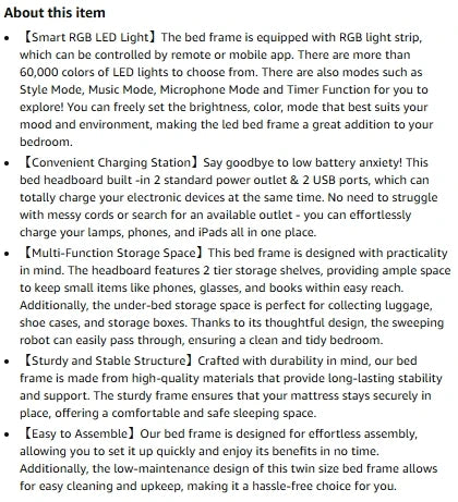 Special Feature No Box Spring Needed, Remote Control, Lighted, Squeak Resistant, USB Port